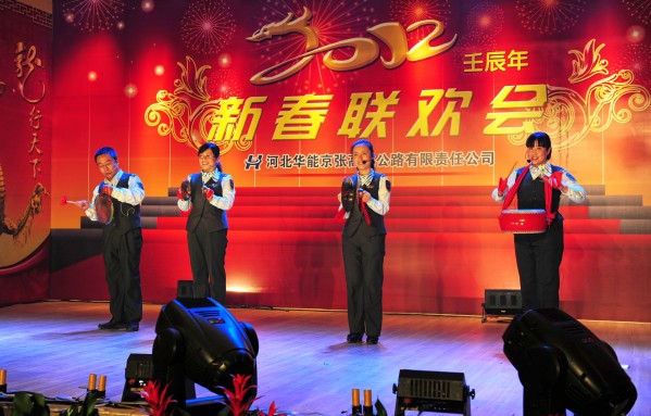 聯(lián)歡會在喜慶歡快的歌舞《開門紅》中拉開序幕。在歷時(shí)兩個(gè)小時(shí)的演出中,來自公司文藝隊(duì)、各部門、站區(qū)的演員為觀眾獻(xiàn)上一臺異彩紛呈、豐富多彩、高潮迭起的精彩節(jié)目。高亢嘹亮的歌唱、賞心悅目的民族舞和現(xiàn)代勁舞,贏得了觀眾的陣陣掌聲。聯(lián)歡會上最受歡迎的是由一些由公司基層一線職工自編自演的音樂快板《兔年京張喜事多》、小品《女友的生日》、三句半《二級路的人和事》、合唱《收費(fèi)員之歌》等節(jié)目,謳歌了公司2011年取得的成就,歌頌了一線收費(fèi)人員甘于奉獻(xiàn)、舍小家為大家、堅(jiān)守收費(fèi)一線的動人事跡,贏得了在場人員的共鳴。最后,聯(lián)歡會在合唱《陽光路上》的優(yōu)美歌聲中圓滿結(jié)束。整場演出高潮迭起,掌聲不斷,展示了公司蒸蒸日上、蓬勃發(fā)展、團(tuán)結(jié)進(jìn)取的新景象,表達(dá)了大家對公司和諧發(fā)展、再鑄輝煌的期望和信心。演出結(jié)束后,公司領(lǐng)導(dǎo)與演員合影留念。