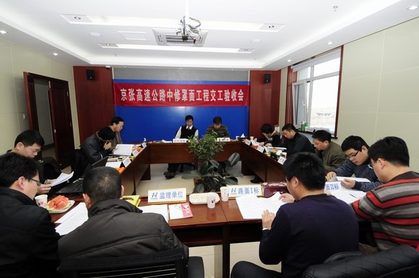 交工驗收組由省公路工程質量監(jiān)督站,京張公司相關部門,京張高速路政支隊,參建本工程的設計、監(jiān)理和施工單位共同組成。驗收組長由京張公司總經理劉建民擔任,副組長由省質監(jiān)站科長張風旗、京張公司副總經理葉成海擔任。