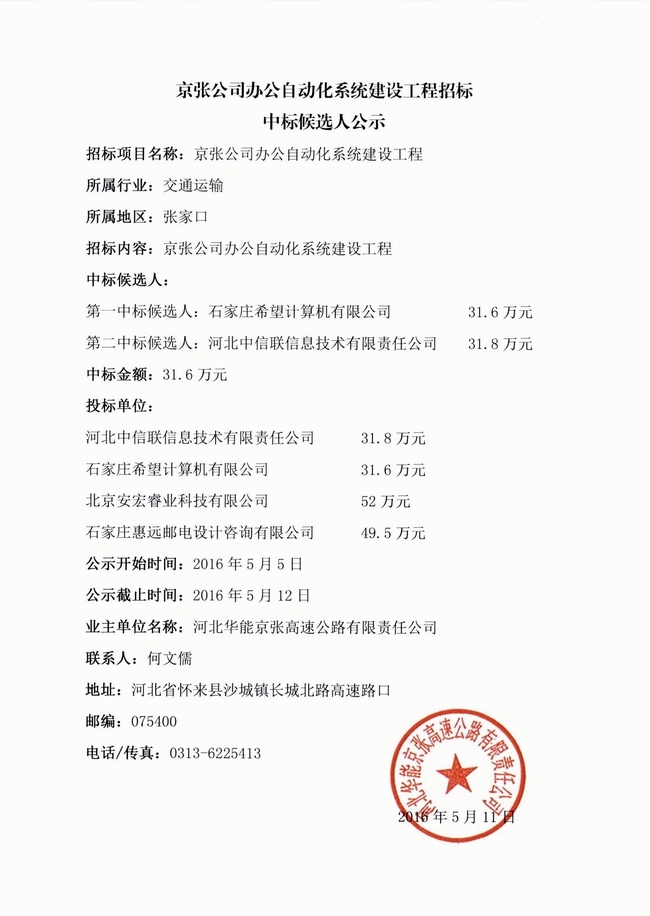 京張公司辦公自動化系統(tǒng)建設工程招標中標候選人公示