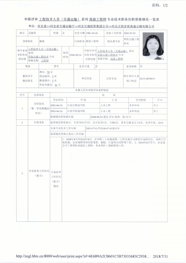 京張公司2018年度專(zhuān)業(yè)技術(shù)職稱(chēng)申報(bào)公示(吳銀利)